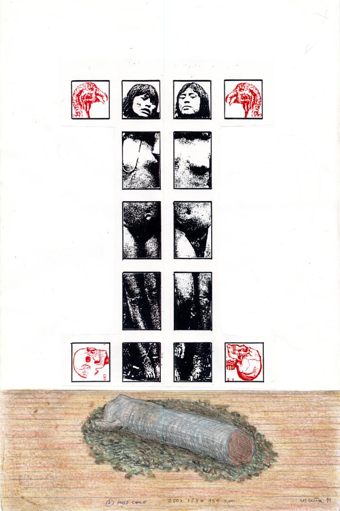 Lapiz grafito y de color e impresiones pegadas sobre papel