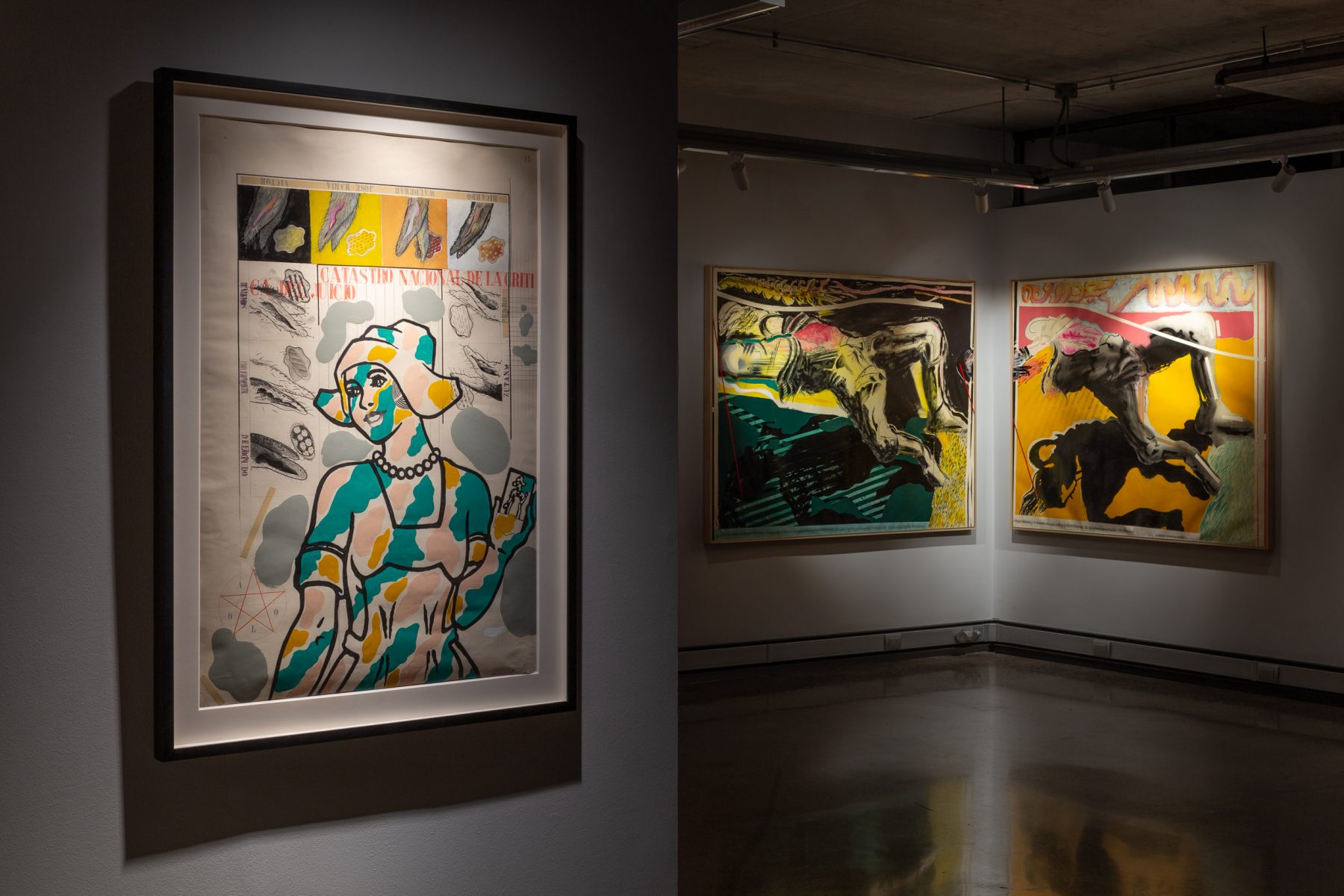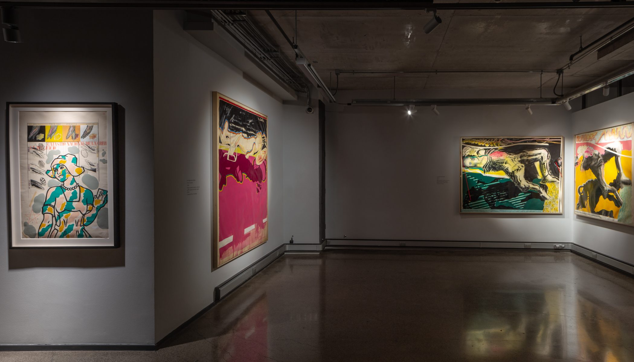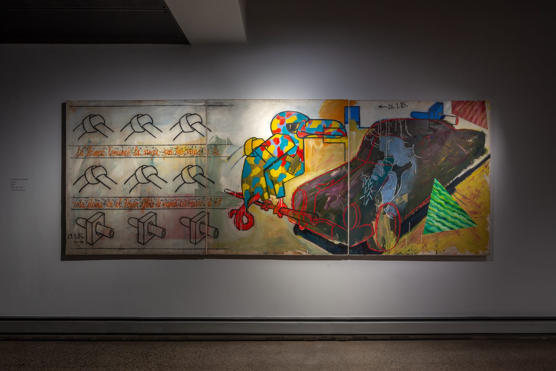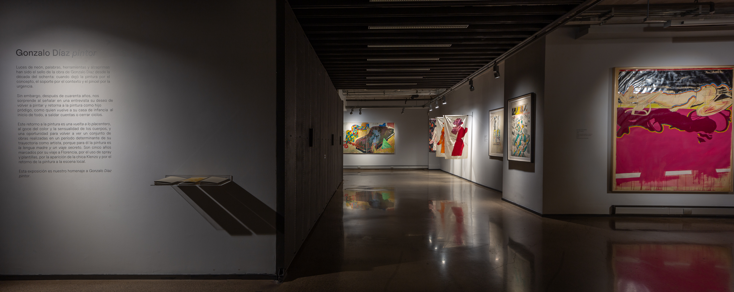 The exhibition Gonzalo Díaz, the painter brings together early works by the artist —including some created during his stay in Florence in the early 80s— that experiment with new pictorial languages and subject to criticism modes of visual representation through the reuse of symbols and elements of Chilean popular culture.