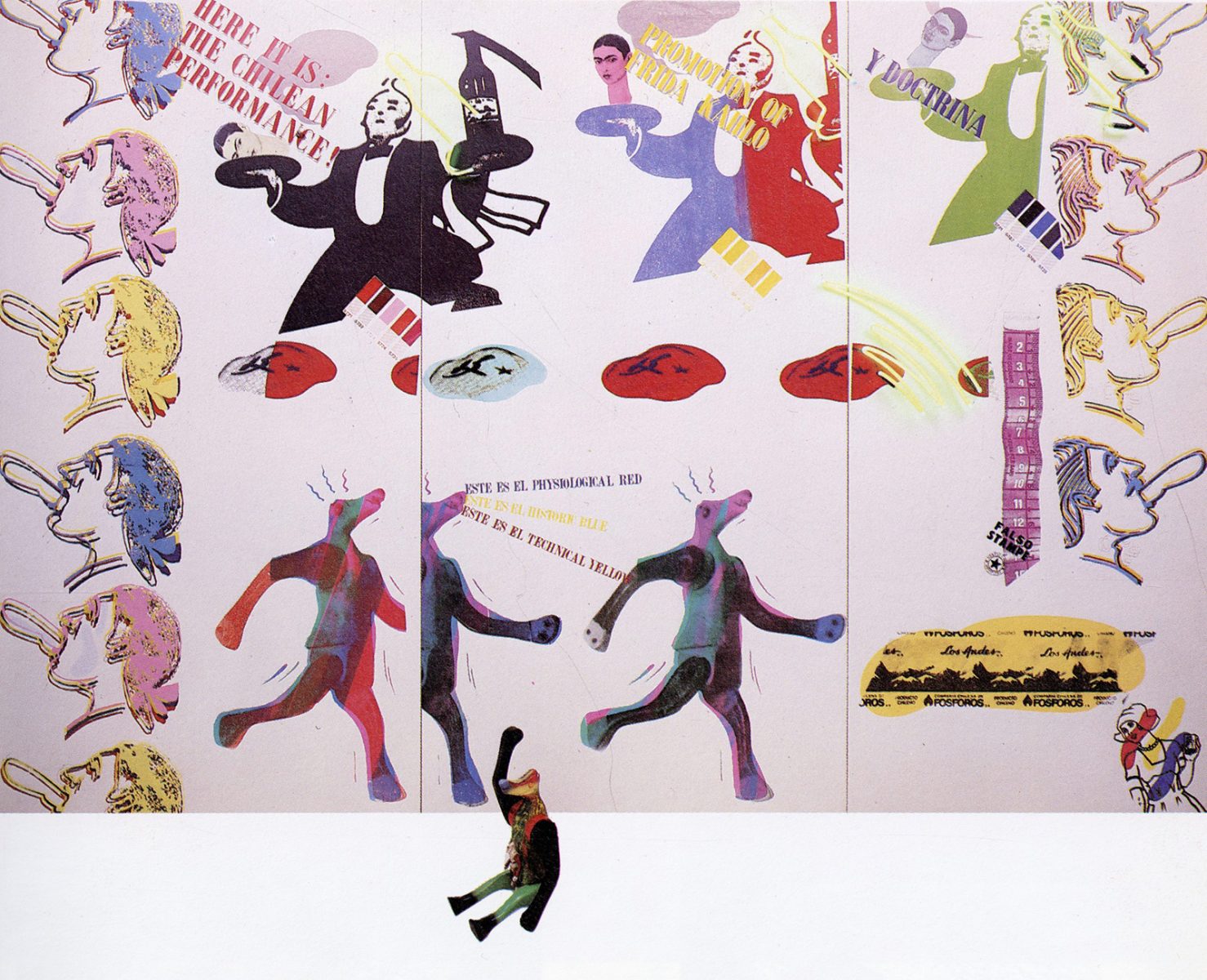 Regarding the links between the patriotic, the political, and the pictorial that emerge in Díaz’s critical strategy, it is interesting to note that much of the implementation of this strategy took place internationally. This can be seen when analyzing the work Let me see if you can run as fast as me (1984), which represented Chile at the 5th Sydney Biennial in Australia, alongside works by Eugenio Dittborn and Juan Domingo Dávila. There, Klenzo’s iconography was joined by that of the Chilean match company Los Andes and the Santa Carolina winery. Thus, in this triptych of monumental dimensions, an eclectic set of icons printed using silkscreen was presented in a vibrant palette of colors, among which stood out that of a waiter dressed in a tailcoat, an icon of Viña Santa Carolina, who runs in a helpful manner to offer Chilean wine—a distinguished national export delicacy—on a tray, and next to him, by the artist’s own hand, the head of Mexican artist Frida Kahlo, an icon and stereotype of Latin American art 25Towards the end of the 1970s and beginning of the 1980s, Frida Kahlo’s status as a pop icon was consolidated. In addition to her first biographies published in Mexico (Del Conde, 1976; Tibol, 1977), 1982 saw the first international retrospective exhibition of her work, Frida Kahlo and Tina Modotti. Opened at the prestigious Whitechapel Gallery in London, it was curated by British filmmakers Laura Mulvey and Peter Wollen, and later traveled to Germany, Sweden, Mexico, and the United States. This coincided with the publication of her first biography in English (Herrera, 1983). “In the early 1980s […] a wave of enthusiasm generated by the rediscovery of her person, her charismatic personality, and her political activism […] genuine admiration that eventually faded over time in light of the commercialism to which the stereotype was subjected, produced and falsely promoted by artistic centers such as New York; She came to represent the artistic image of an entire continent,“ Mari Carmen Ramírez in ”Cómo se yergue el ícono Frida” [How the Frida Icon Rises] [conference], Museum of Latin American Art of Buenos Aires, September 21, 2022.. All this was offered to a hungry international audience. The waiter reproduced on each of the triptych panels was accompanied by the following captions (two of them in English, as was the title of the work): “Here it is: a Chilean performance!”, “promotion a Frida Kahlo,” “y doctrina.”