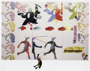 Despite the above, the truth is that pop art did not cease to be relevant after 1973. As the escalation of events that led to Chile’s institutional breakdown unfolded, artists who had traveled abroad returned loaded with references, including pop art, which they would later use in the development of their works. Thus, notable productions from the post-coup period incorporate strategies that refer to this style. To cite a few examples, Roy Lichtenstein’s treatment of the American comic book image in his paintings was crucial to the development of Eugenio Dittborn’s practice, who returned in 1972 from a four-year training trip to Europe. Regarding this experience, the artist has stated: “[During my stay] I saw an exhibition by Lichtenstein—the first Lichtenstein I had ever seen—and that was absolutely decisive for me.”12Centro para las Humanidades UDP. «La ciudad en llamas – Eugenio Dittborn (Primera Parte)». Vídeo de Youtube, 03:31. 31 de marzo de 2020 https://www.youtube.com/watch?v=0akngGYD8q4. And then he specifies: “it determined my entire subsequent search.”13Centro para las Humanidades UDP, «La ciudad en llamas – Eugenio Dittborn (Primera Parte)», 05:23.. Along the same lines, the use of newspapers as raw material by British pop artists was central to the development of Catalina Parra’s collage work. In 1969, while living in Germany, she visited an exhibition entitled “Information: Tilson, Phillips, Jones, Paolozzi, Kitaj, Hamilton” at the Kunsthalle Basel (Switzerland). Through sixty-six works, this exhibition offered an overview of the latest metropolitan art movement in full bloom. In the artist’s words: “There were works by Paolozzi, Kitaj, Hamilton, among others, and I realized that they worked with elements of everyday life, and that had a big impact on me. From that moment on, that way of working had a great influence on my work”14Catalina Parra. «Contextualizándonos: Una conversación para comenzar». In Catalina Parra. El fantasma político del arte, ed. Paulina Varas Metales Pesados. 2011), 20.. The poet Ronald Kay made a similar point: “Knowledge of Pop was very important to me, […] Hamilton, for example, has a piece full of references to newspapers. Likewise, I re-enact some things in Variaciones [Ornamentales]»15Ronald Kay. «La imágen, una pasión. Conversación entre Ronald Kay y Bruno Cuneo», in Paisajes espectrales: Tentativas sobre Ronald Kay, ed. Andrés Soto & Francisco Vega (Editorial Cuarto Propio, 2019), 192..
