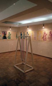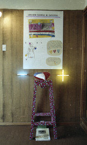 From this point of view, it is particularly interesting to note two small installations that brought Klenzo into contact with national iconography in Díaz’s exhibition at Galería Sur: the first, a heart-shaped pin cushion in the colors of the national flag displayed on a colorful stool leaning against the wall and under a poster entitled “National Sculpture Competition”; and the second, a wooden structure bearing the words “national song of painting ch” and from which hang, by means of tricolor ribbons, five small bags with unidentified contents. The link between the national and the pictorial is made explicit here through allusions to different instances of artistic recognition and/or consecration. The national anthem, the national competition, the national registry of critics, the national honorable mention award, and the tricolor flag are all elements that point to the use of painting as an instrument for constructing the patriotic, enabling the introduction of the political into this critical strategy.
