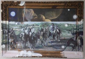 Next to Wynnie Mynerva’s painting is the equally monumental and unsettling Neuquén 1984 (2018) by Natalia Babarovic, who works with oil and spray paint on a copy of a work by Italian maestro Guido Reni. Instead of bowing to the tradition of classicism, Natalia resorts to irreverence and blurs the boundaries between “high” and “low” culture, merging different pictorial styles into a large, stained, hybrid, and beautiful piece. Not only is the canvas altered, but also the elaborate frame made of fleshy leaves carved in wood, which ultimately disrupts everything: the motif and the painting’s scene. Her work, therefore, is an accomplice to the provocation directed at the museum.