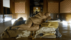 More than a decade ago, Naufus chose to perform at the KIT (formerly known as the Royal Tropical Institute) in Amsterdam, created to “study the tropics and promote trade and industry in the Dutch colonial territories”6This is stated by the institution itself on its website. For more information on this, see the Brief History of KIT, which is available online: https://www.kit.nl/about-us/our-history, that is, to promote the exploitation of “tropical” products. In this building brimming with signs of imperialist opulence, he installed himself, naked, on a plinth of mattresses, cushions, and foam sheets, tied to them with ropes as if they were all part of the same armchair. He did so in a room of marble, stone, and fine wood which, like the Temporary museum, has walls with ornamental moldings, rosettes, dentil cornices, and, of course, an elaborate wallpaper that gives it a somewhat old-fashioned look.