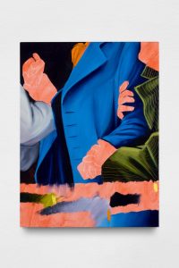 Among the organic forms that Fernanda Laguna paints in her Éxodo de mi mente hacia un cuadro marrón y azul (“Exodus from My Mind to a Brown and Blue Painting”) (2013) and Composición con cerveza (“Composition with Beer”) (2012), there is a nod to the gestures with which her compatriot Lucio Fontana began the so-called Serie de los tajos (“Slit Series”) in 1958. But those surgical incisions that Fernanda inflicts on her canvases resonate not only with the radical practice of cutting, but also reveal the performative decision to interrupt: the landscape, tradition, everything. The slashes are suspensions of meaning and windows through which the wall of the Temporary museum is exposed. These gaps serve the same purpose as the vibrant colors with which Ana Segovia represents an embrace on his canvas: to disconcert and disrupt continuity, proposing detours.