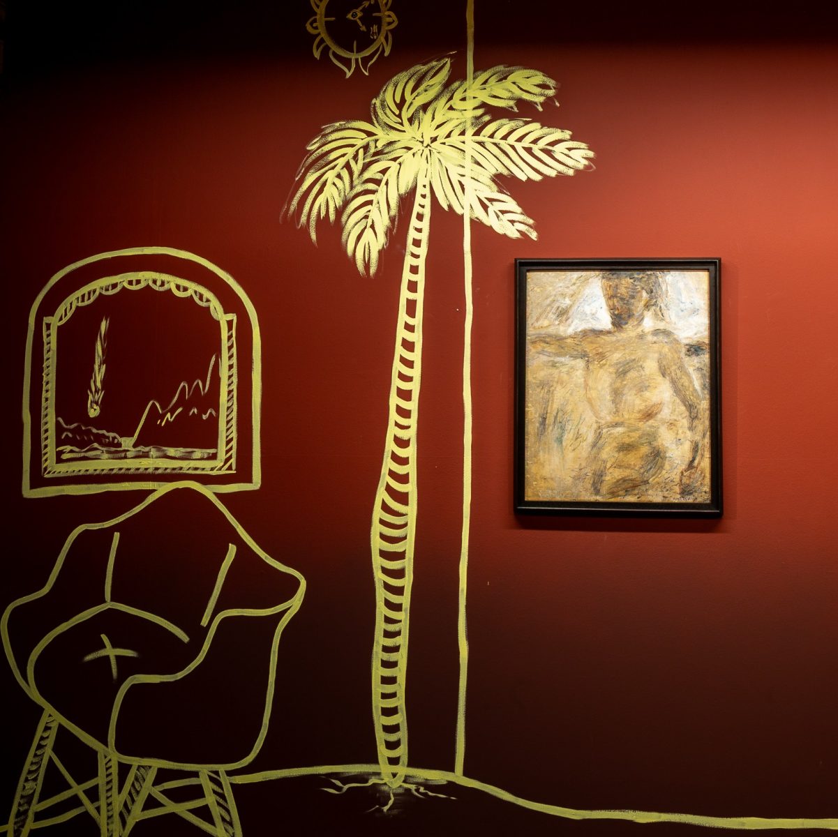Wiki depicted a door and its peephole, painted an enigmatic wallpaper with a floral pattern that appears to have wings, drew baseboards and crown moldings, opened a window through which we see the landscape, but also the 3I/Atlas—while installing spotlights and surveillance cameras. She added complexity to the building-institution-museum, showing us its domestic dimension by including a calendar with a cross marked on the last Thursday of the month and key hooks. She disrupted the room’s interior with a vigilant sun and a tropical palm tree. Then she painted a beautiful carpet that looks at us and left a pair of shoes in a corner, near a small table where an electric kettle is about to short-circuit. By allowing flames to break in, far from the fire hose, she brought disaster, and by covering the cracks in the walls, she exposed it as a precarious place. The museum presents itself to us in crisis. Unstable, insufficient. We see this (modern?) institution, full of setbacks and contradictions, discredited as a machine for selection and framing.