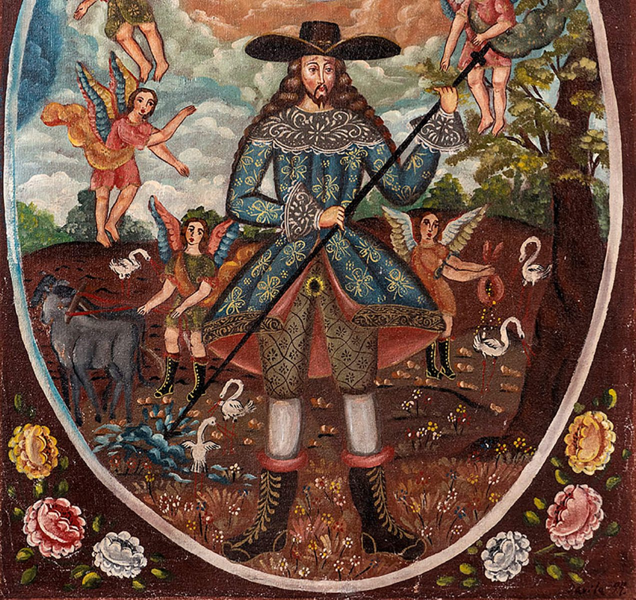 Untitled (Conquistador) (1994) by Juan Dávila, which could be considered the exhibition’s epigraph, presents us with a sort of original mythology of the western traveller. This conqueror, portrayed in the style of the colonial painting of the Cuzco School, looks at the new world he has discovered with a lost and absent gaze. He is surrounded by angels who protect and exalt him, but he has no weapon in his hands, nor a phallus between his legs8This observation was made by Josefina Lewin in the preparation of the exhibition.