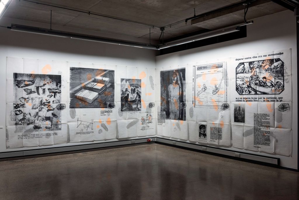 In the third fold we find the work of the Mexican artist Teresa Margolles (1963) and the Ecuadorian artist Adrián Balseca (1989). Not only do the works of both embody and inscribe themselves in the urgent discussions on human displacement, but they themselves are constantly on the move by way of exploration and linkage with their respective case studies. In the case of Margolles, her two large-format photographs record the border situation at the Simón Bolívar Bridge in the city of Cúcuta over two periods of time. Deferred for two years, the artist’s records portray the women who transport goods on the border between Venezuela and Colombia. Carretilleras sobre el Puente Internacional Simón Bolívar (2017) portrays the women who, before the closure of the border between the two countries, were dedicated to moving these goods with wheelbarrows across the bridge. When we go around this photograph and look at its back side, we find Trocheras con Petral (2019), which shows a group of women who, since the closure of the border in 2017, have continued to transport these goods in a clandestine manner through routes known as “trochas”. In contrast to the previous image, these women no longer carry the heavy goods with their wheelbarrows, but with the strength of their own shoulders and the support of a rudimentary cloth and rope garment.