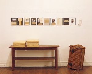 This familiarly distant object evokes a similar sensation to that which unfolds in the narrative and objects that make up Nury González’s El Mercado negro del Jabón (1999), which is located next to Eugenio Dittborn’s Airmail Painting. This piece reconstructs the migration of her mother, uncle and grandmother from Spain to France through the border crossing at the Catalan coastal town of Port Bou in 1940. The same journey, made at the same time but in the opposite way, by the German philosopher Walter Benjamin, is illustrated in one of the pieces that make up the work. Benjamin, after learning that he would be deported back to Nazi-occupied France, took his own life at the Hotel Francia in Port Bou, the same place where, before leaving for Toulouse, the artist’s grandmother, Josefa Berenguer, stayed for two nights. In the last of the ten paintings that make up a fragment of González’s work, we see his grandfather, Modesto Andreu, carrying a basket of wickerwork in which he moved the soaps made clandestinely by the family in the refugee house in Toulouse. The same basket is now on the right-hand side of the work, on the floor of the room.