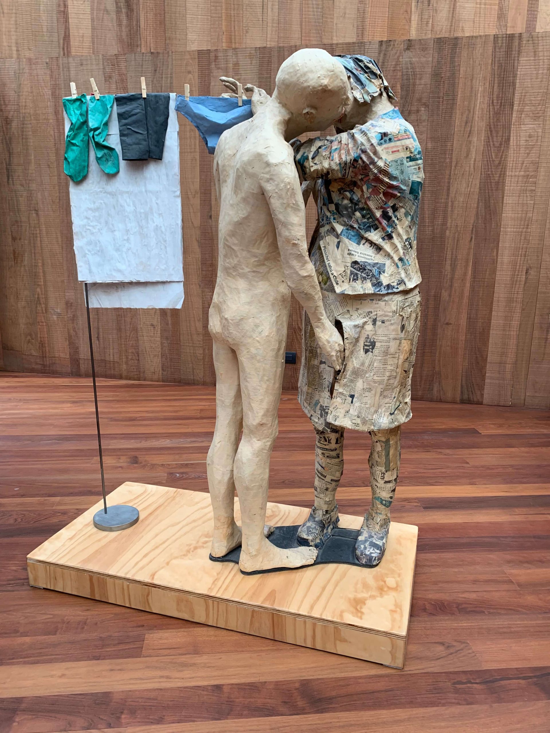 Working with industrial produced materials, such as paper and plastics bags, creates objects and human figures in real scale.