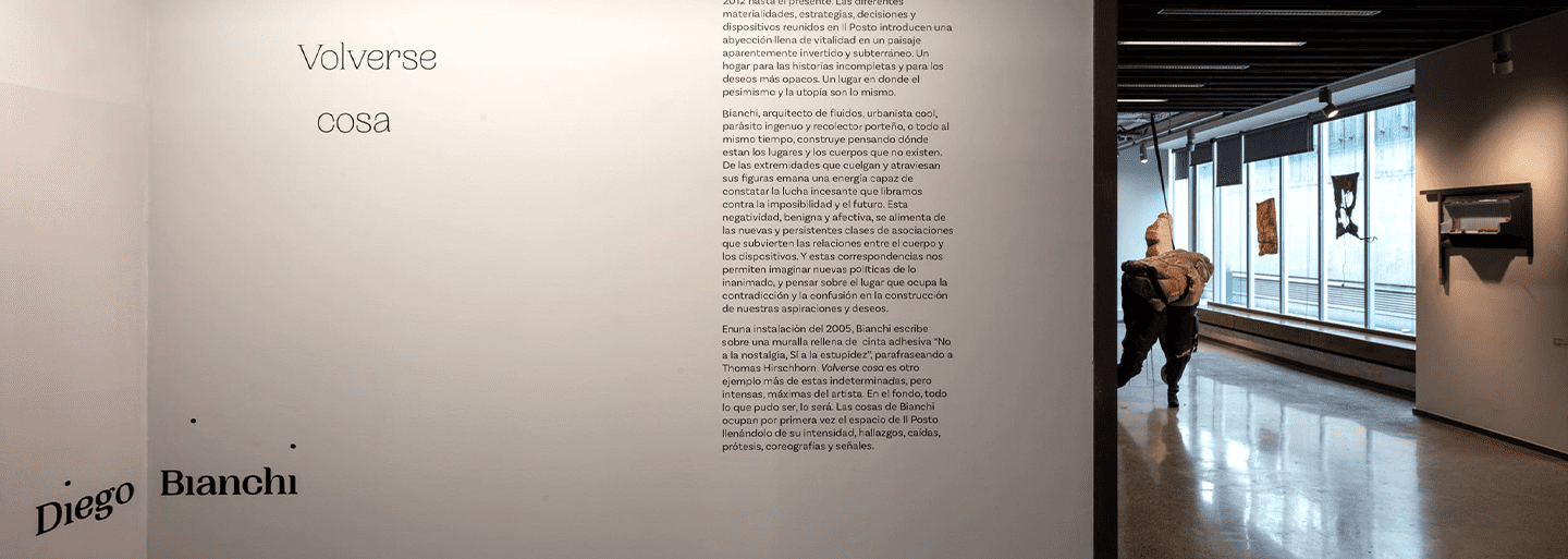 In 2005, paraphrasing Thomas Hirschhorn, Bianchi develops an installation where you can read over a wall full of tape “No a la nostalgia, Sí a la estupidez.” Volverse Cosa is another example of more of this undetermined, but intense peaks of the artist. In the end, everything that it could be, it will be. The cosas of Bianchi occupy for the first time the Il Posto space, filling it with its intensity, findings, falls, prothesis, choreographies and symbols.