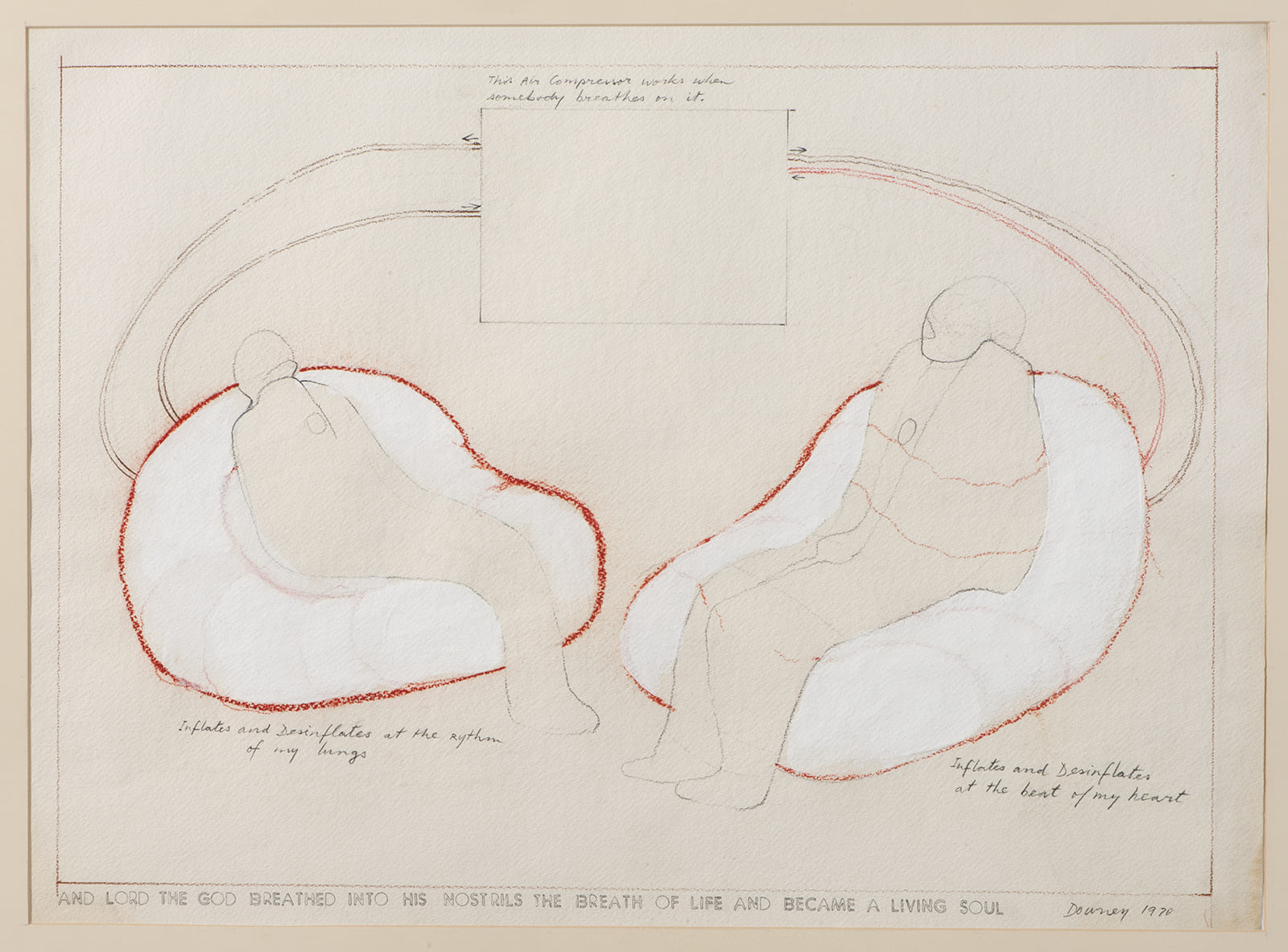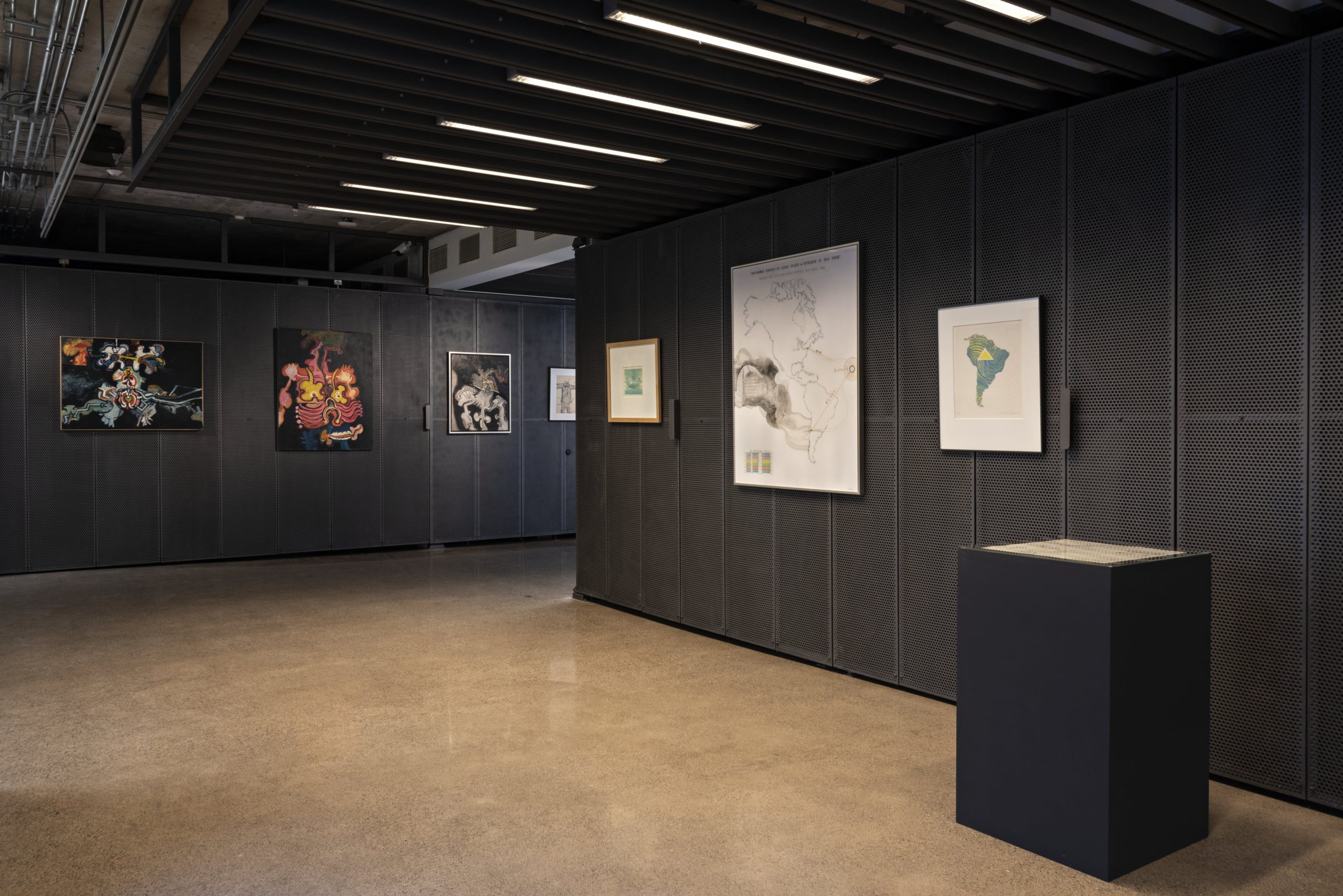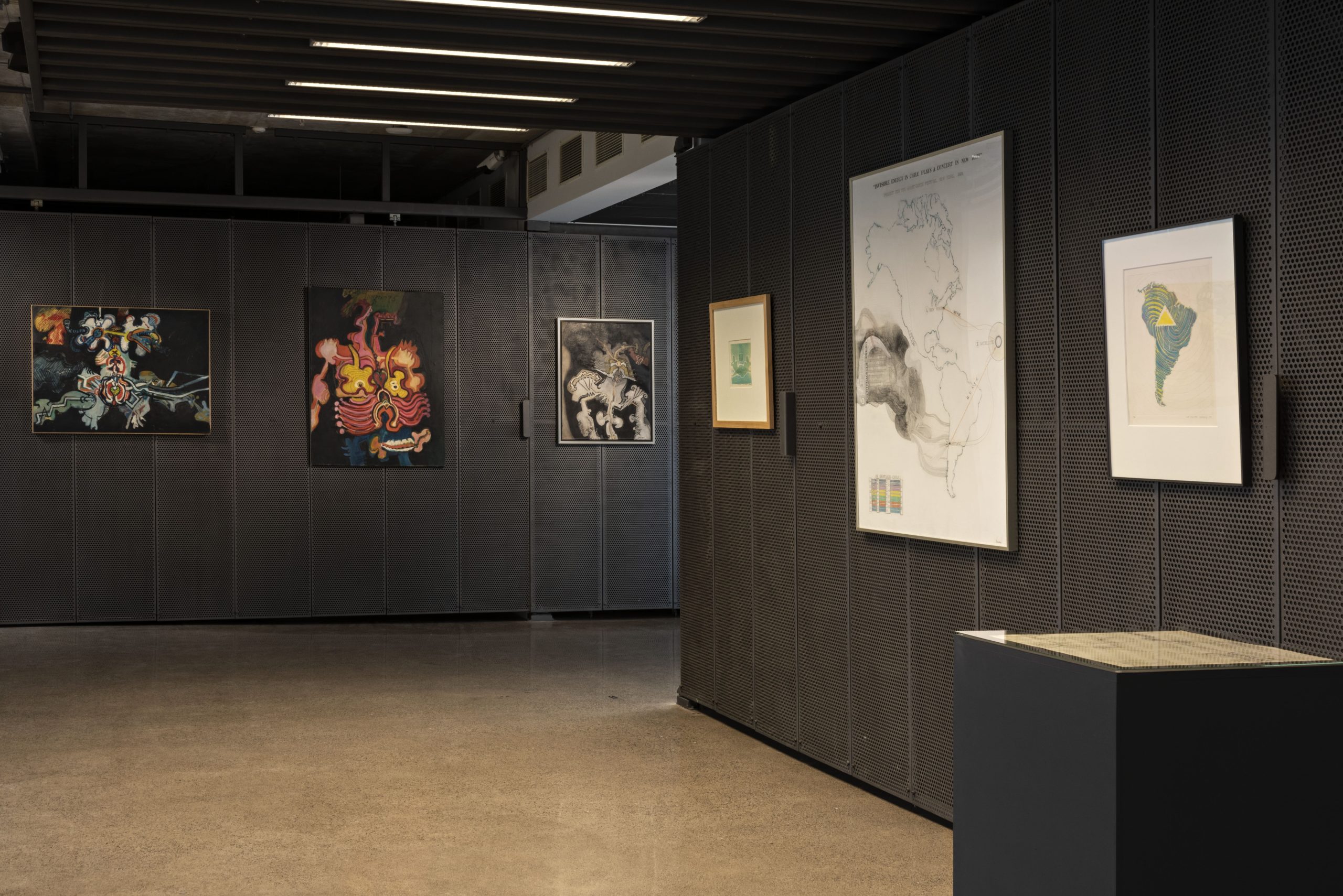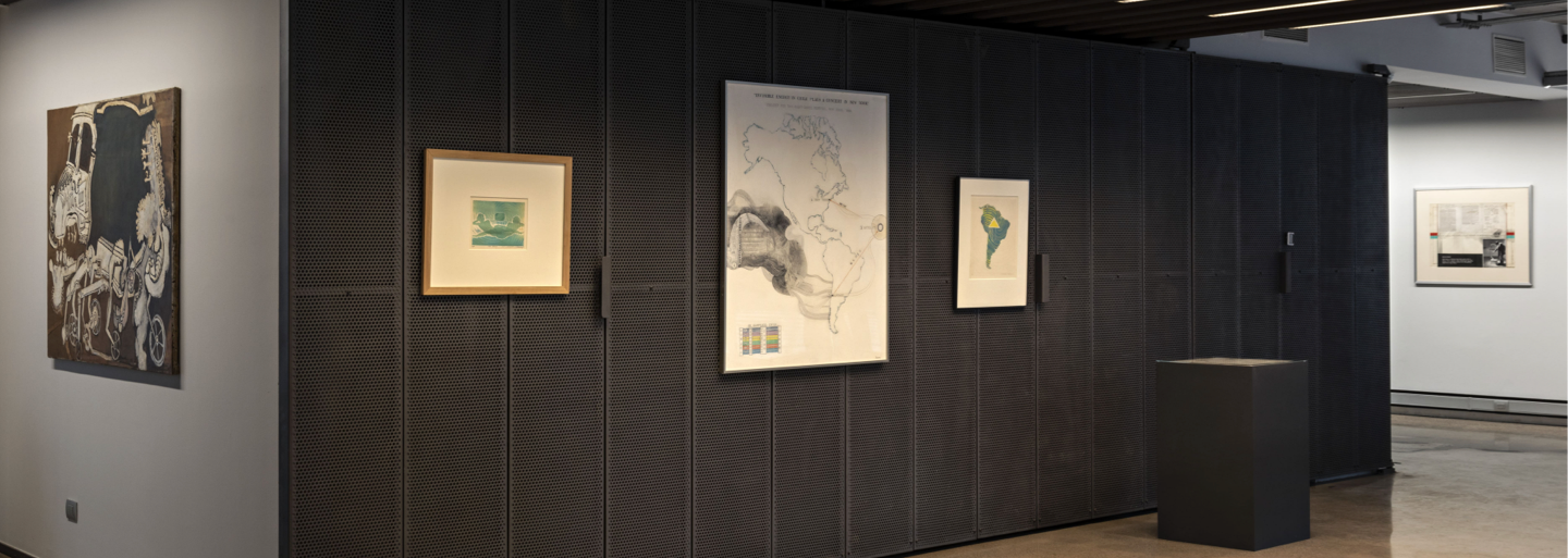 John Downey. El nudo de la vida contains three defined curatorial coordinates. The first, Transubstancias del cuerpo y la máquina (“Transubtances between the body and the machine”), is made of a series of nine paintings and engravings that can be located in the frontiers of figuration and abstraction and adress motifs related to life, death, the body, the machine, infinity, bestiality, and eroticism, among others. In these notions one can appreciate the visual, expansive and radical complexity of Downey’s  perception of the human being and his challenging encounter with technology. The second coordinate, Utopías tecnológicas: Energías, ondas y territorio, invites (“Technological Utopias: Energies, waves and territory”) us to explore the relationships between these concepts based on the possible influence enabled by some of the technologies available at the time. In four pieces, one can see Downey’s impulse to establish artistic and technological networks in the American continent through cutting-edge means such as satellite interconnectivity. The third coordinate is named Diagramas y sistemas complejos (“Diagrams and Complex Systems”) and consists of three drawings that investigate forms of thought and visual models in relation to the history of philosophy, art and psychoanalysis, as well as the relationship of the body and its communicational functions with energy and mechanics.