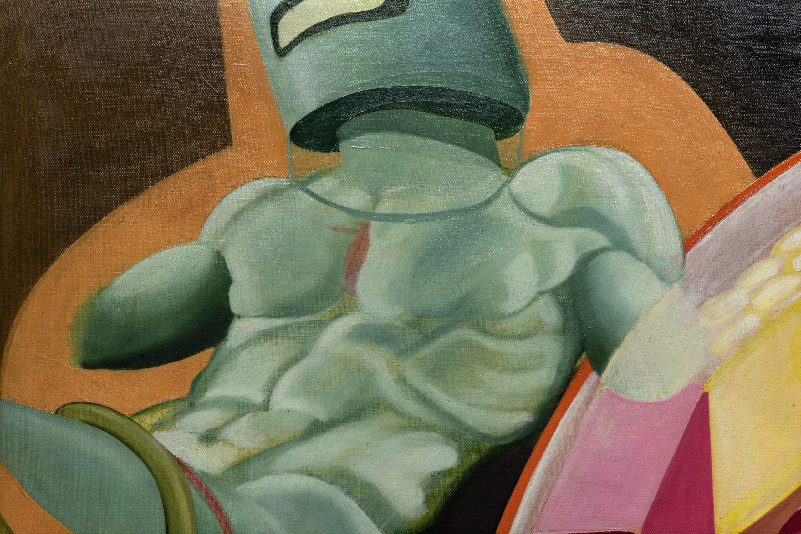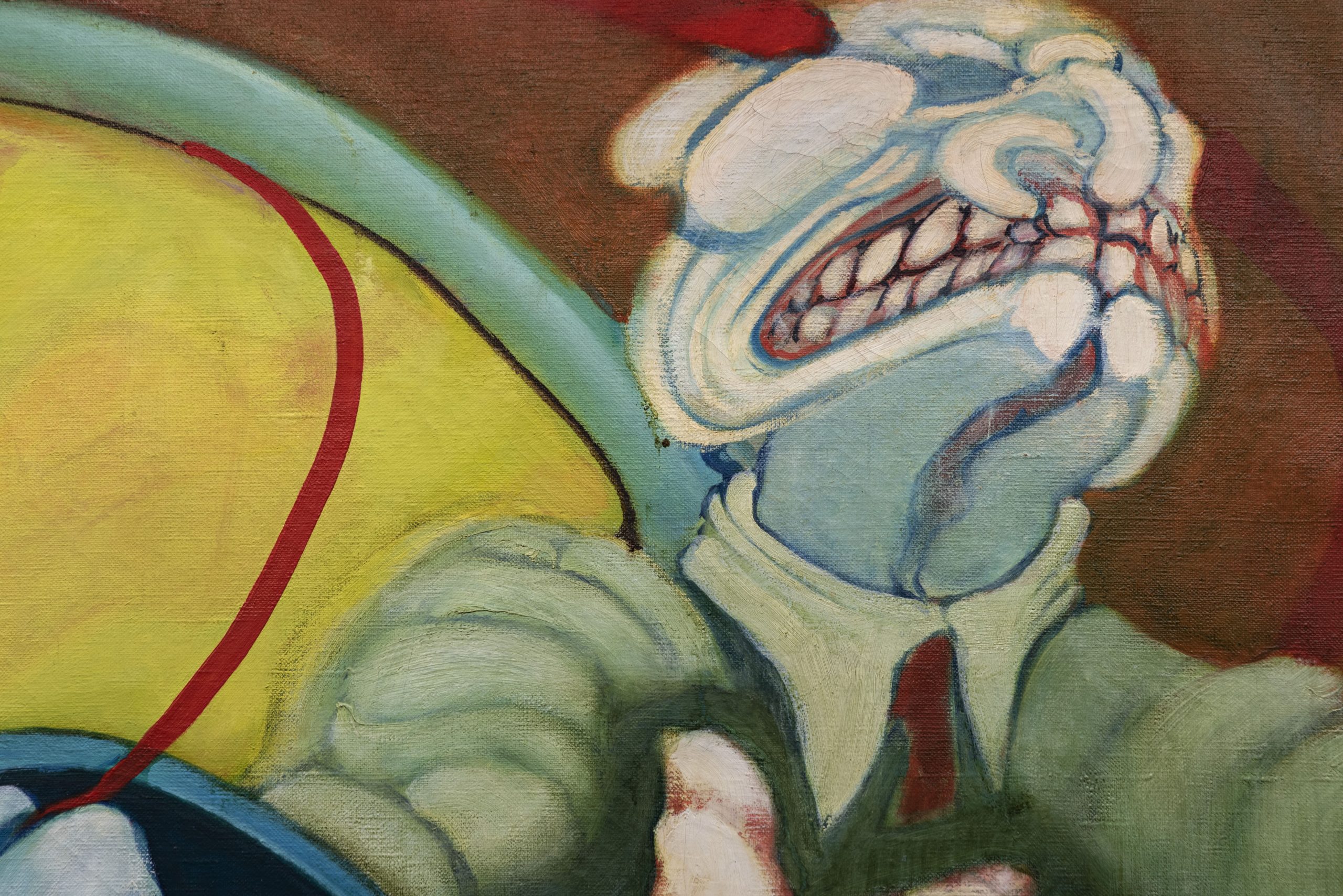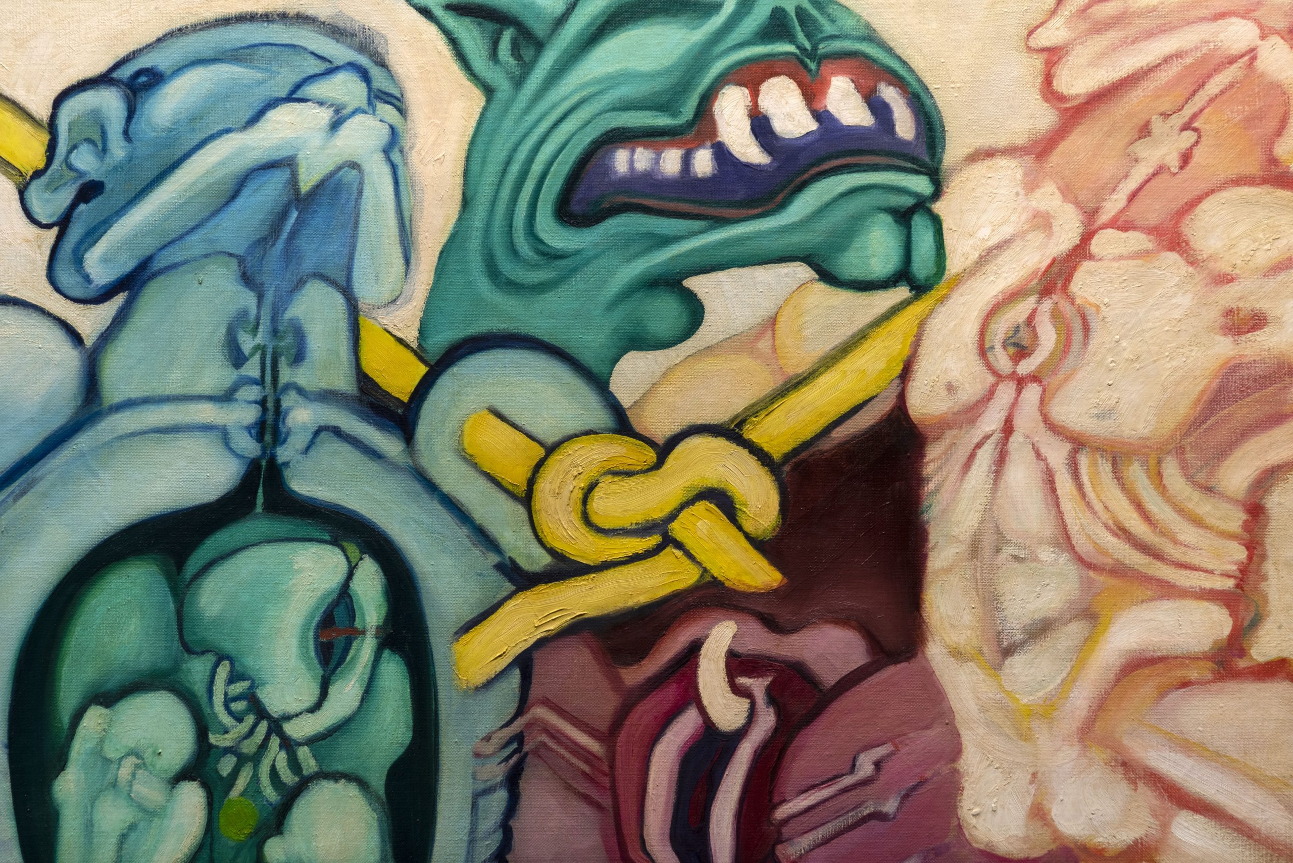 John Downey. El nudo de la vida contains three defined curatorial coordinates. The first, Transubstancias del cuerpo y la máquina (“Transubtances between the body and the machine”), is made of a series of nine paintings and engravings that can be located in the frontiers of figuration and abstraction and adress motifs related to life, death, the body, the machine, infinity, bestiality, and eroticism, among others. In these notions one can appreciate the visual, expansive and radical complexity of Downey’s  perception of the human being and his challenging encounter with technology. The second coordinate, Utopías tecnológicas: Energías, ondas y territorio, invites (“Technological Utopias: Energies, waves and territory”) us to explore the relationships between these concepts based on the possible influence enabled by some of the technologies available at the time. In four pieces, one can see Downey’s impulse to establish artistic and technological networks in the American continent through cutting-edge means such as satellite interconnectivity. The third coordinate is named Diagramas y sistemas complejos (“Diagrams and Complex Systems”) and consists of three drawings that investigate forms of thought and visual models in relation to the history of philosophy, art and psychoanalysis, as well as the relationship of the body and its communicational functions with energy and mechanics.
