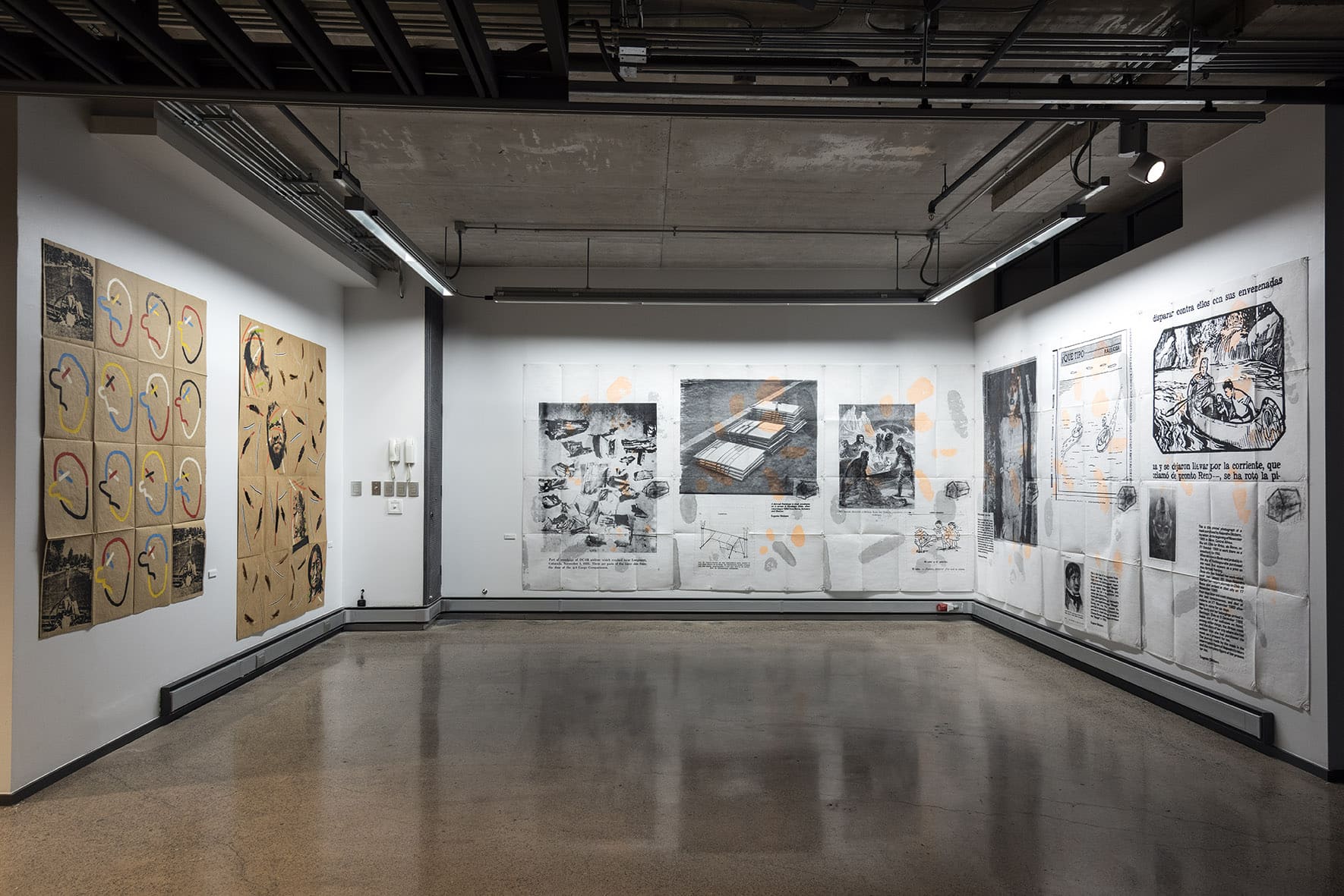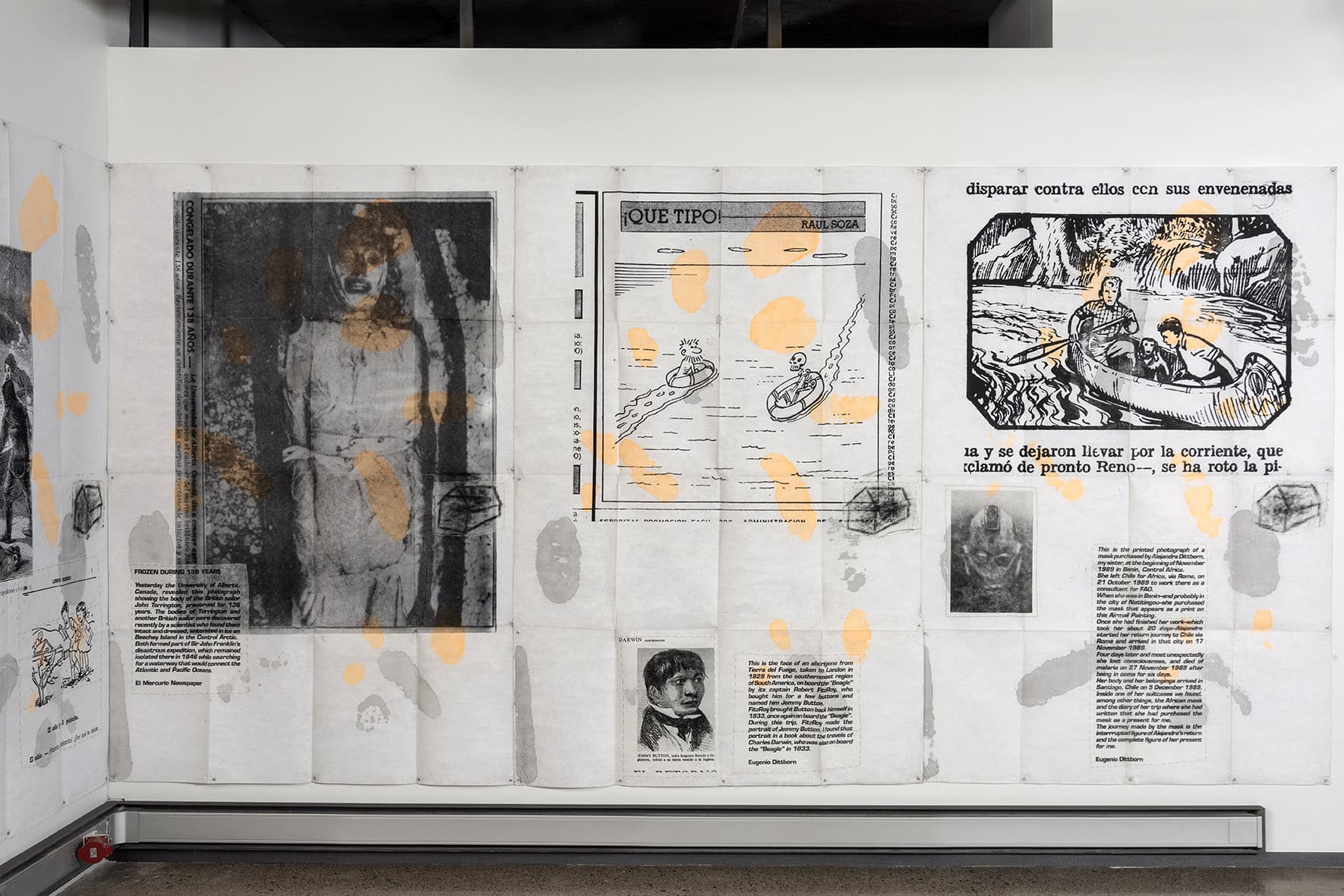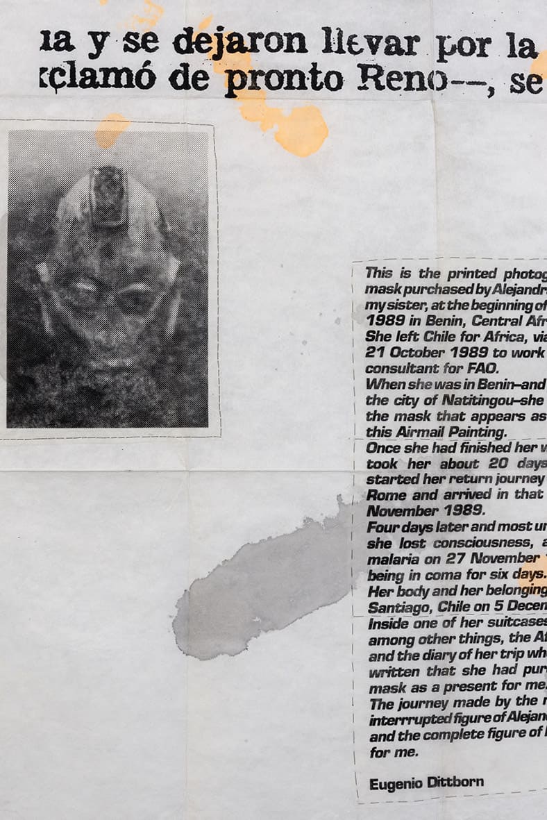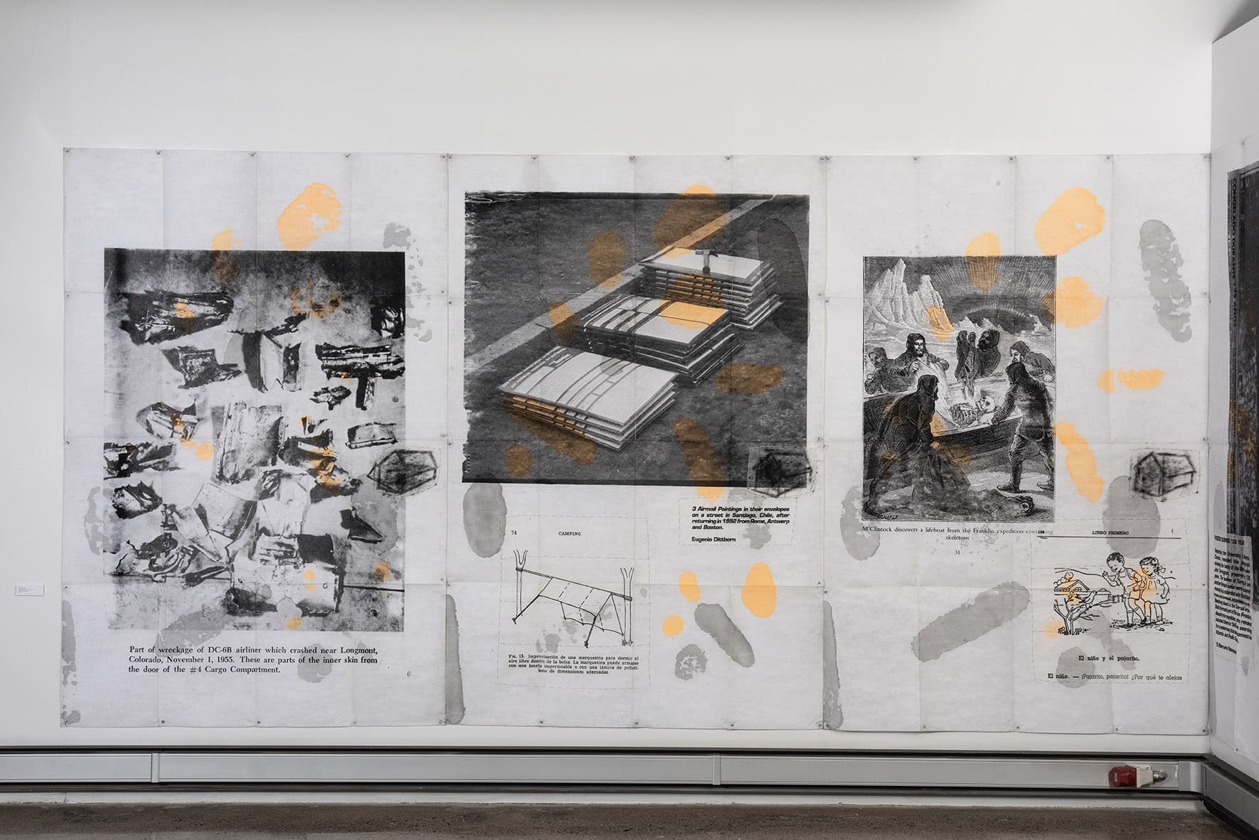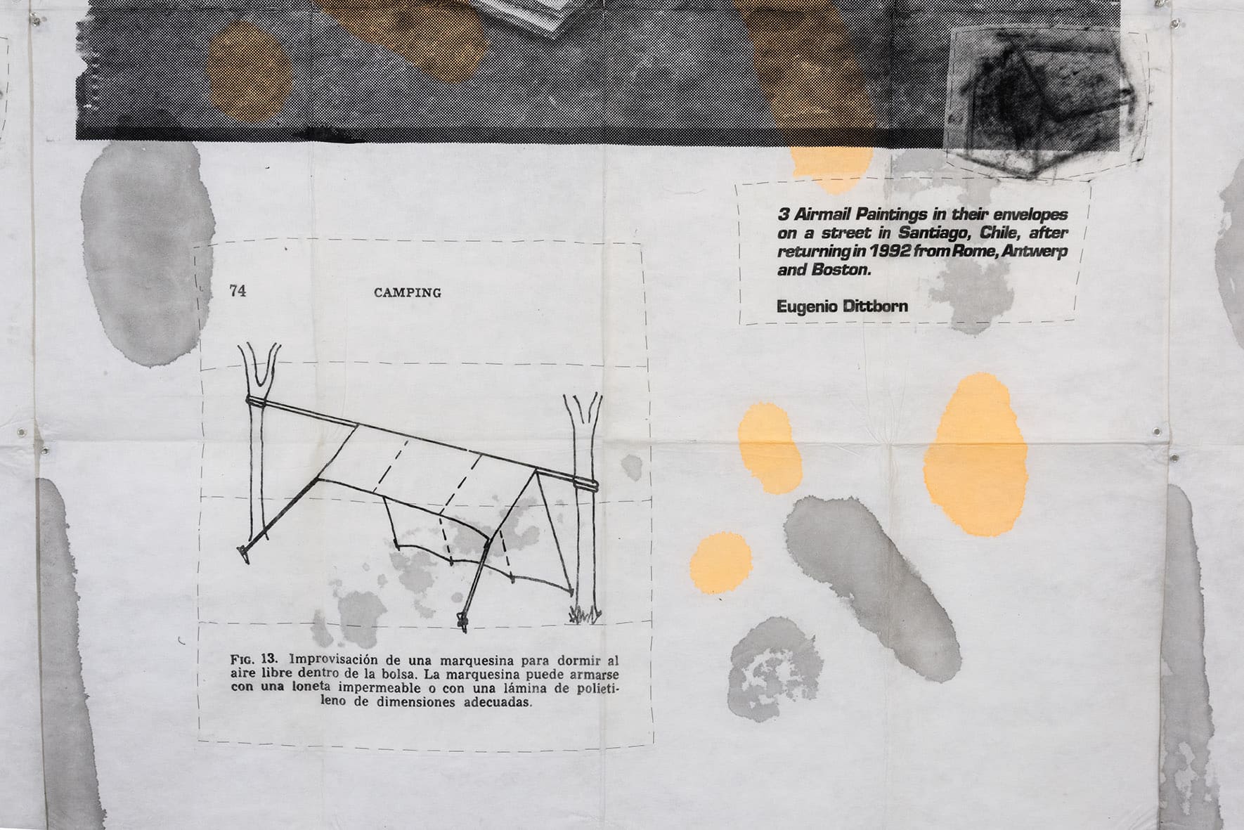 «Trabajos, 1969-2017» («Works, 1969-2017») is a singular exhibition of Eugenio Dittborn’s trajectory over the last fifty years. The works that coexist here -from the airmail paintings to the last drawings made by Dittborn before he «stopped working with his hand»-effectively capture the attitude of an artist that distrusts last words and all fixed states of affairs (including that of his own work). Little by little and at a rhythm of small discoveries, this constellation of images and visual practices allows us to see what Ana María Risco calls an authentic pictorial poetics. A poetics where things that seem absolutely indeterminate are, in reality, the result of a calculation, in the same way that things that seem absolutely calculated lead us incessantly to the indeterminate.”