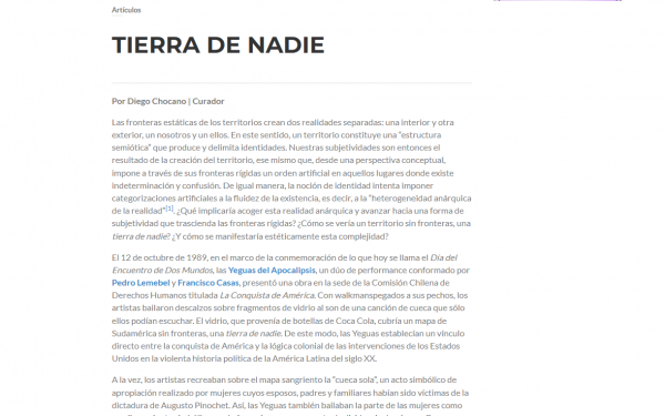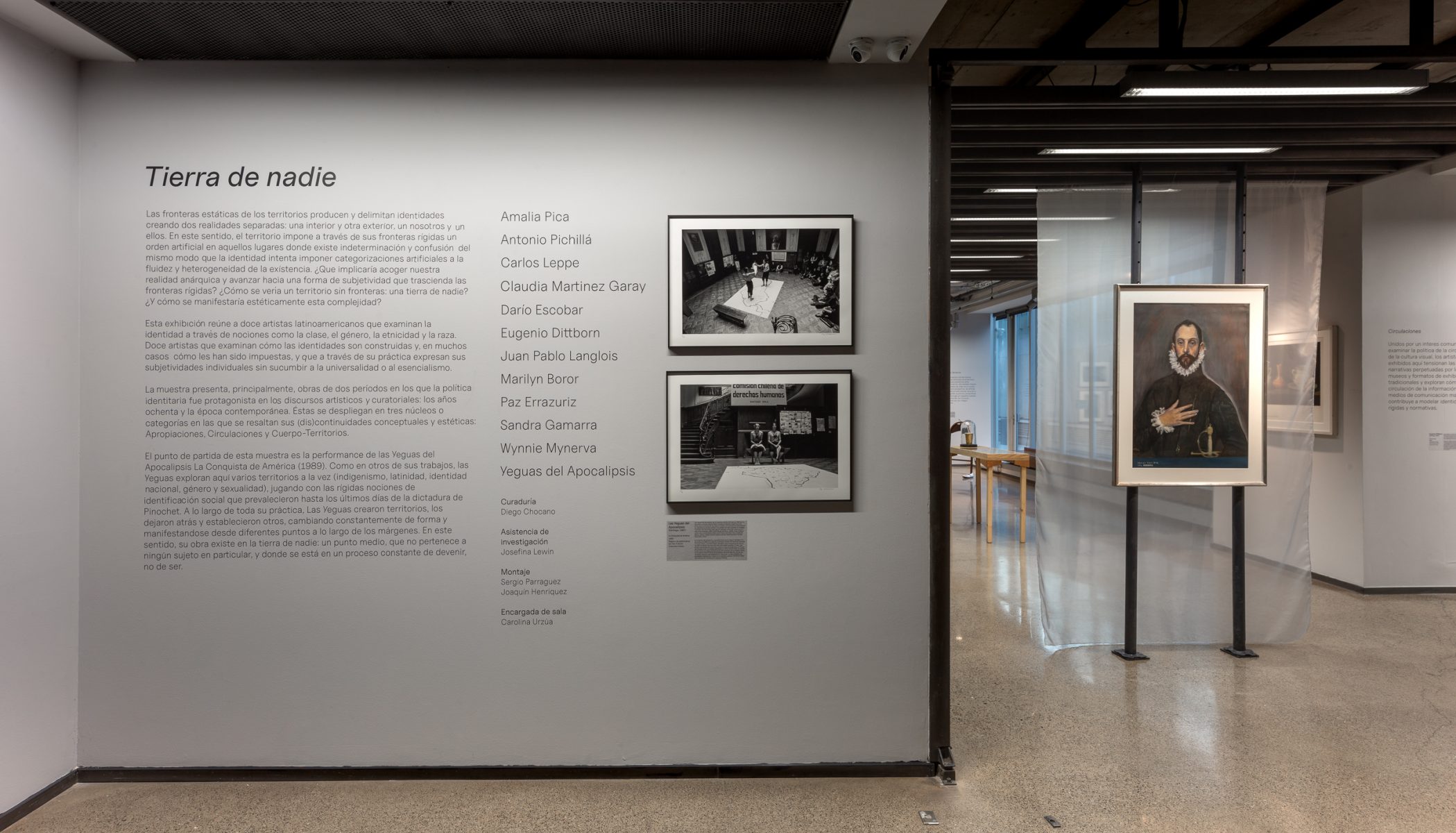 El punto de partida de esta muestra es la performance de las Yeguas del Apocalipsis La Conquista de América (1989). Como en otros de sus trabajos, las Yeguas exploran aquí varios territorios a la vez (indigenismo, latinidad, identidad nacional, género y sexualidad), jugando con las rígidas nociones de identificación social que prevalecieron hasta los últimos días de la dictadura de Pinochet. A lo largo de toda su práctica, Las Yeguas crearon territorios, los dejaron atrás y establecieron otros, cambiando constantemente de forma y manifestándose desde diferentes puntos a lo largo de los márgenes. En este sentido, su obra existe en la tierra de nadie: un punto medio, que no pertenece a ningún sujeto en particular, y donde se está en un proceso constante de devenir, no de ser.