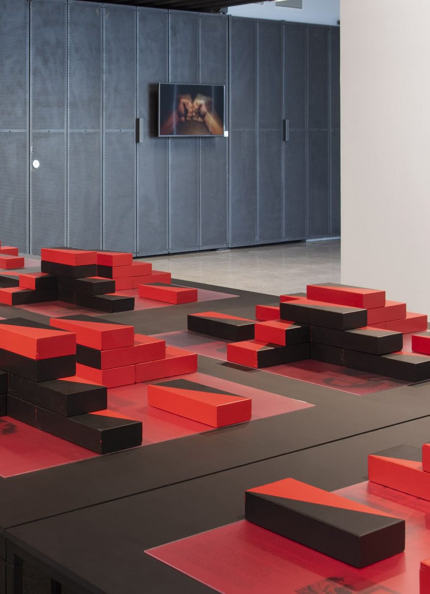 En El ladrillo (2018-2019), Patrick Hamilton exhibe sobre una mesa un montaje de archivos que permiten releer los modos en que el neoliberalismo se implementó en Chile mediante una “terapia de shock” que terminó deviniendo luego una forma de vida.