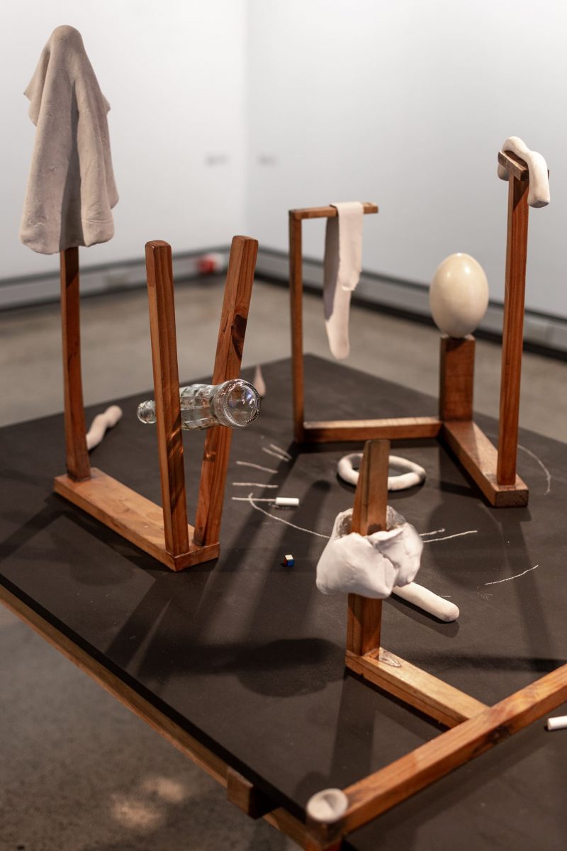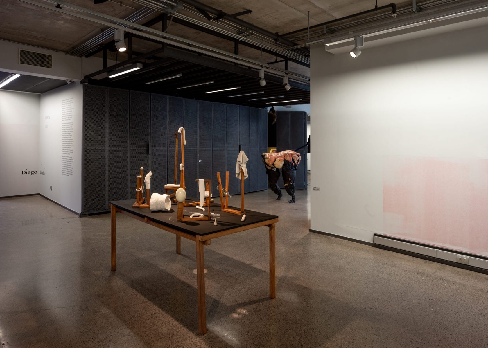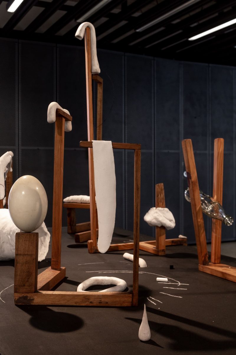 Bianchi, arquitecto de fluidos, urbanista cool, parásito ingenuo y recolector porteño, o todo al mismo tiempo, construye pensando dónde están los lugares y los cuerpos que no existen. De las extremidades que cuelgan y atraviesan sus figuras emana una energía capaz de constatar la lucha incesante que libramos contra la imposibilidad y el futuro. Esta negatividad, benigna y afectiva, se alimenta de las nuevas y persistentes clases de asociaciones que subvierten las relaciones entre el cuerpo y los dispositivos. Y estas correspondencias nos permiten imaginar nuevas políticas de lo inanimado, y pensar sobre el lugar que ocupa la contradicción y la confusión en la construcción de nuestras aspiraciones y deseos.
