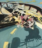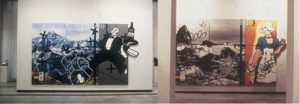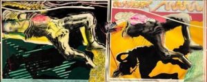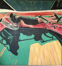 Por otro lado, si volvemos a la parte inferior del retablo, veremos una Sepultación de Cristo (fig. 12) que nos remite a los cuerpos tendidos horizontalmente en los accidentes de ciclismo que protagonizan la obra Los hijos de la dicha (1981), díptico realizado por Díaz durante su estadía en Florencia (fig. 13).