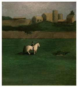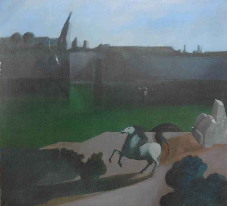 Sea identificada como el arco neoclásico del paraíso, o como la entrada al pozo del infierno, para inspeccionar más esta figura del umbral conviene saltar a San Jorge y el Dragón - Creación de la conciencia (1975-76) (fig. 26), cuyo motivo ecuestre se rastrea ya en una pintura de Díaz encontrada en el catálogo de la Colección Pérez-Stephens, titulada El Paraíso Perdido (1973) (fig. 27). Cercana al San Jorge y el dragón de Rafael Sanzio (1504) (fig. 28), con los trucos ópticos de La tempestad de Giorgione (1508) (fig. 29), y algo de la Batalla de San Romano de Paolo Uccelo (1436-1440) (figs. 30 y 31), que el propio Díaz citará en Políticas de la Perspectiva (2010) (fig. 32), la primera de estas pinturas presenta diferentes referencias renacentistas, aunque sin el carácter ensayístico que definirá más tarde los intertextos del artista. Son motivos metafísicos, en donde lisa y llanamente se tantea el límite de la existencia. La Laguna Estigia, que le da un título alternativo a esta obra24Es preciso señalar que dos versiones diferentes de esta pintura han sido halladas, entre las cuales, aún cuando parecen corresponder al mismo cuadro, se distinguen tanto por la tonalidad cromática de su registro como por su título. En primer lugar, la que apreciamos en el Archivo Gonzalo Díaz está fichada como: San Jorge y el Dragón - Laguna Estigia (1975-76), con tonos más terrosos y grisáceos; mientras que por otro lado, al consultar el catálogo de exposición de Tres pintores tres escultores y un poeta (1977) en Galería Época, vemos la misma imagen con un acabado de colores más saturados, bajo el nombre de San Jorge y el Dragón – Creación de la conciencia. En el Archivo Gonzalo Díaz, la primera (cuyo registro podemos visualizar sobre un atril) incluso difiere entre los títulos que usa al pie de foto (“GD-O-0003 San Jorge y el Dragón - Creación de la conciencia”) y en su ficha de obra (“San Jorge y el Dragón - Laguna Estigia”). Mientras que San Jorge y el Dragón - Creación de la conciencia, aparece fichada como una obra aparte, cuya imagen no ha sido ingresada aún. En el presente escrito, a modo de evitar las confusiones hemos optado por hablar exclusivamente de San Jorge y el Dragón - Creación de la conciencia, usaremos el registro obtenido del mencionado catálogo por cortesía de Pedro Montes, y referiré a la Laguna Estigia solo para salvar la referencia mitológica que nos brinda su título., corresponde en la mitología de Ovidio al límite con el tártaro o inframundo, y así en este lienzo vemos personajes entre sombras perdidas y un sugerente uso de la contraforma, de modo tal que la fisionomía de ciertas siluetas sombrías e inertes parece animada por una vitalidad secreta.