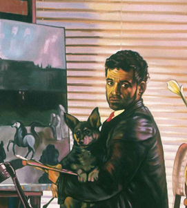 Para rerminar, vayamos al detalle: una cala amarilla asoma como un foco de luz a los ojos del artista, quien por lo demás parece proyectardos sombras diferentes: una verosímil diseminada en los tonos violetas del muro que se funde en el cielo del cuadro; y otra alegórica estampada en negro sobre la pintura. Luego, entre esta sombra y él, hallamos a la bestia: un perro faldero que mira desprejuiciadamente al espectador, consciente de estar siendo observado.