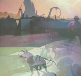 En primer lugar, hay que mencionar que en Las Faenas de Babel (1977-1978), pintura de Díaz reproducida en el cuarto número de la revista El arco y la Lira29, apreciamos la misma escena de San Jorge y el Dragón - Creación de la conciencia vista desde el ángulo opuesto. Es decir, el cuadro queda espejado en reversos artificiales que remiten a un espacio compartido y ponen en relación ambas imágenes (figs. 42 y 43).
