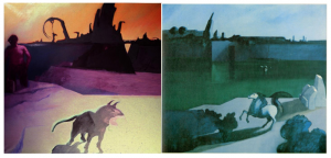 Fig. 44. Registro de la pintura Las Faenas de Babel de Gonzalo Díaz volteada en transparencia sobre su San Jorge y el Dragón – Creación de la conciencia, ambas de 1979.