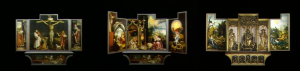 Fig. 6. De izquierda a derecha, se aprecia la apertura sucesiva de los paneles que componen el Retablo de Isenheim (1516). Fotogramas extraídos del documental El retablo de los ardientes – Matthias Grünewald, de la serie Palettes, producción televisiva francesa escrita y dirigida por Alain Jaubert.